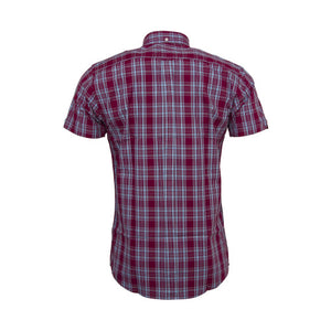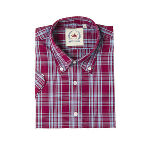 Burgundy/Sky Check Short Sleeve Shirt with Button Down Collar