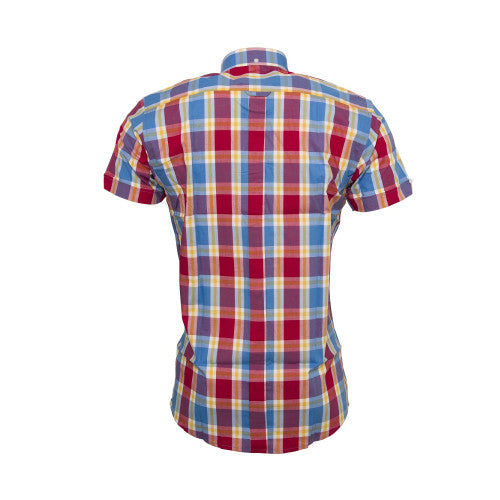Men's colourful multi check shirt, complete with an iconic 3 finger button down collar, full length back box pleat, V- Cut out on sleeve.